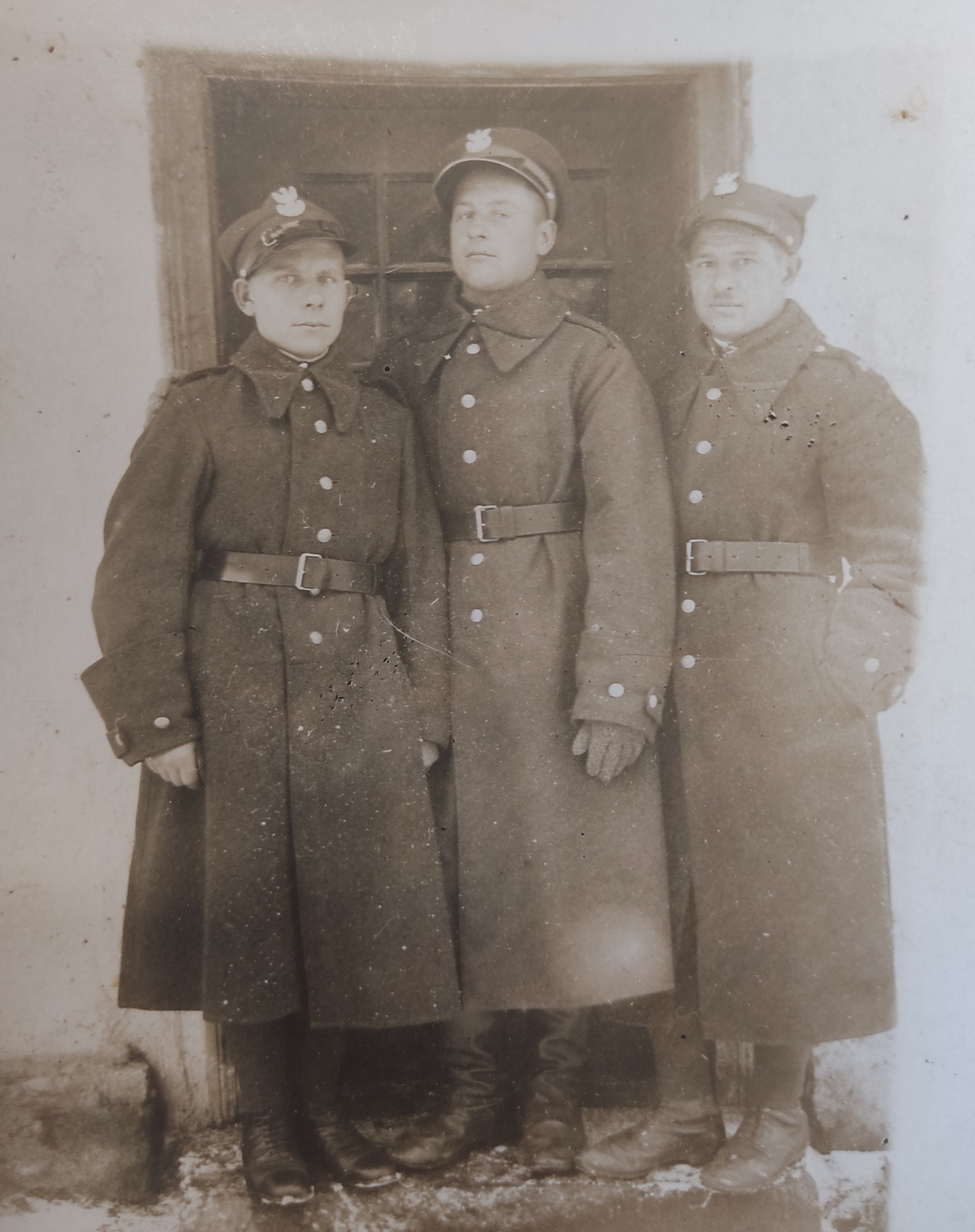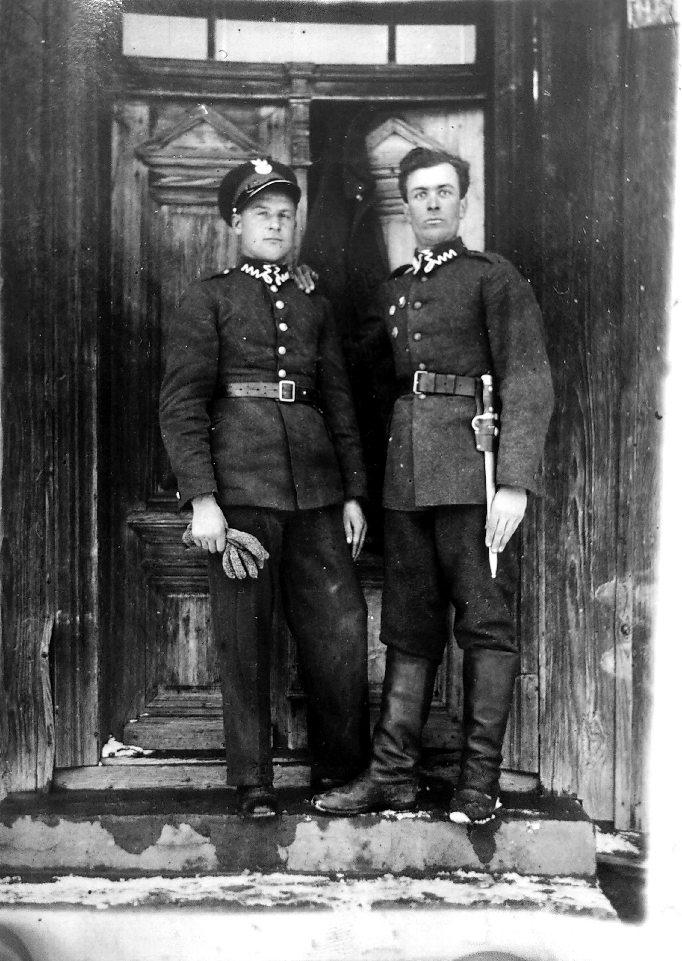 - Fot. 4. Porucznik Antoni Stachura (po lewej) i plutonowy Mieczysław Ignasik (po prawej). Zdjęcie wykonano w 1935 roku, przy drzwiach wejściowych do domu Państwa Stachurów, przy ul. Dąbrowskiego w Żabnie. Mundury (wz. 19) oraz wyposażenie potwierdzają ich służbę w Korpusie Ochrony Pogranicza. U boku pasa plutonowego Ignasika widoczny jest bagnet produkcji francuskiej do karabinu Berthier wz. 1892 z długim jelcem. Na jego mundurze znajduje się również Państwowa Odznaka Sportowa (POS), przyznawana za pozytywny wynik próby sprawności fizycznej.