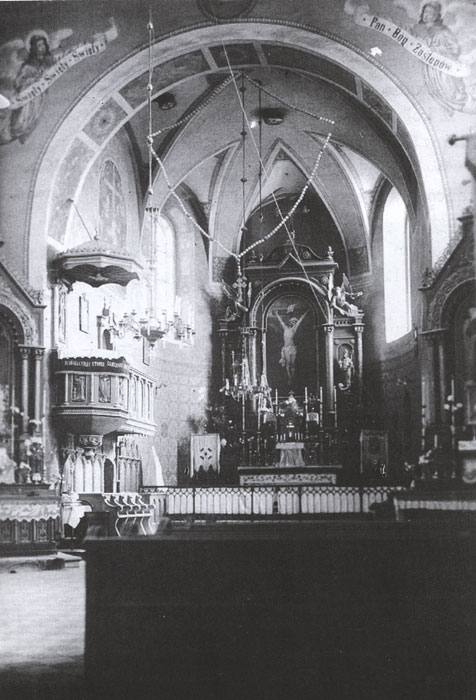 Elementem zespołu kościelnego jest ogrójec z rzeźbami z 1866 roku autorstwa Jana Wnęka. Dachy są kryte blachą: nad prezbiterium i nawą główną dwuspadowe, nad przybudówkami pulpitowe. Nad korpusem nawowym znajduje się wieżyczka na sygnaturkę z latarnią. Wnętrze podzielone pilastrami nie sięgającymi stropu; prezbiterium przykrywa sklepienie kolebkowe z lunetami, przybudówki – sklepienia krzyżowe, nawa główna i część frontowa – strop płaski, a nawy boczne – sklepienia żaglaste.